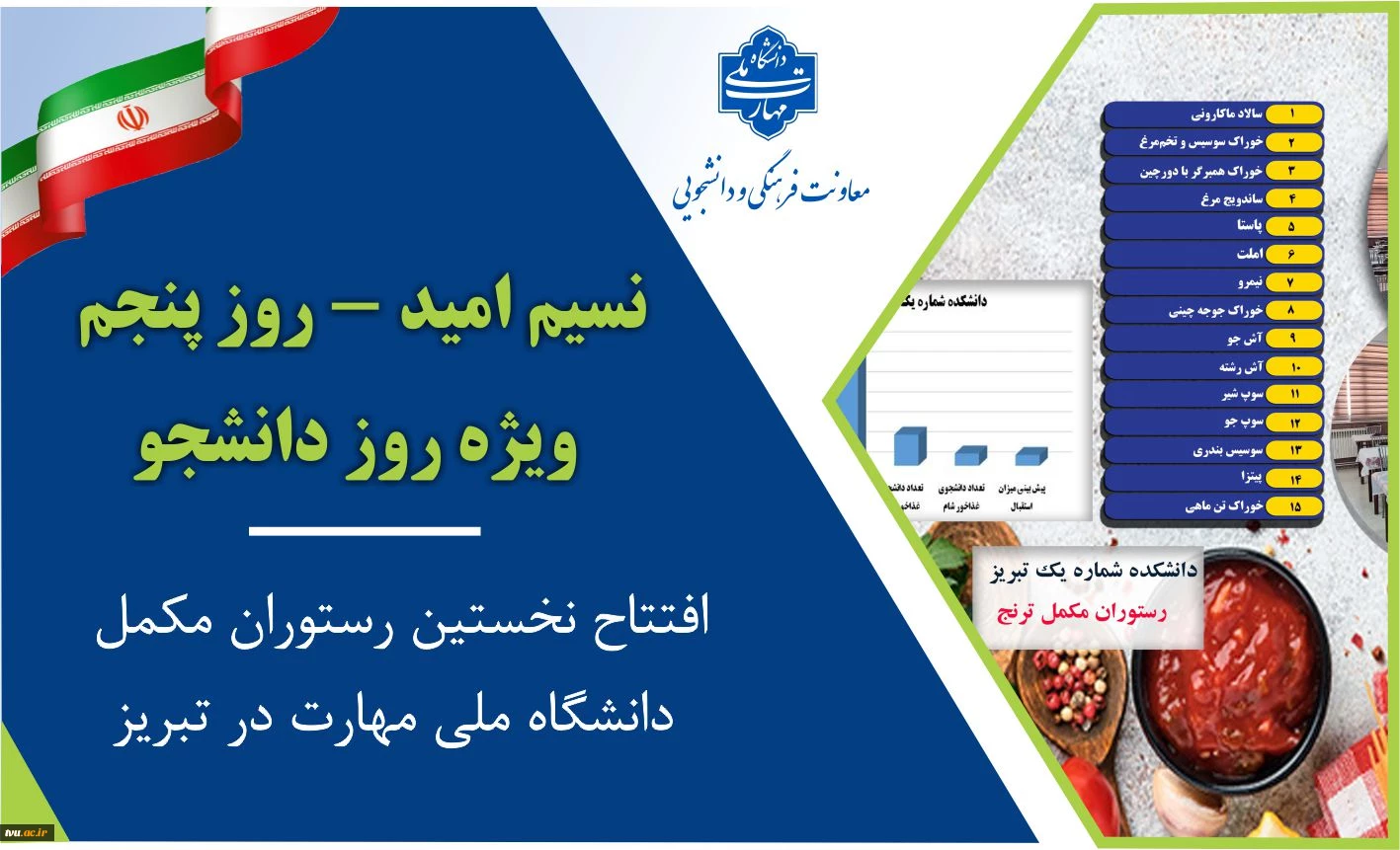 نخستین رستوران مکمل دانشگاه ملی مهارت با حمایت معاونت فرهنگی و دانشجویی و تلاش واحد استانی آذربایجان شرقی، در مرکز پسران شماره یک تبریز آغاز به کار کرد؛ اقدامی که نویدبخش ارتقای کیفیت تغذیه و تنوع خدمات برای دانشجویان است.