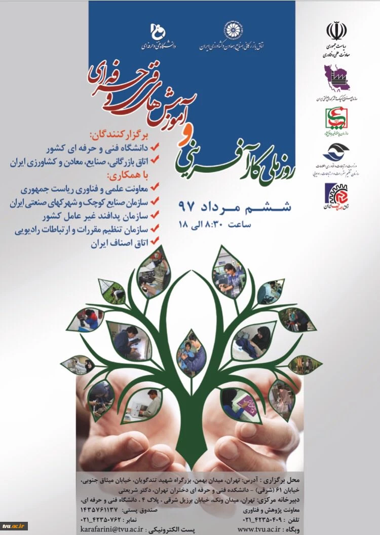 امتیاز دهید : ششم مرداد97 روز ملی کارآفرینی و آموزش های فنی و حرفه ای محل برگزاری : دانشکده شریعتی یکشنبه 10 تیر 1397 ساعت 16:20