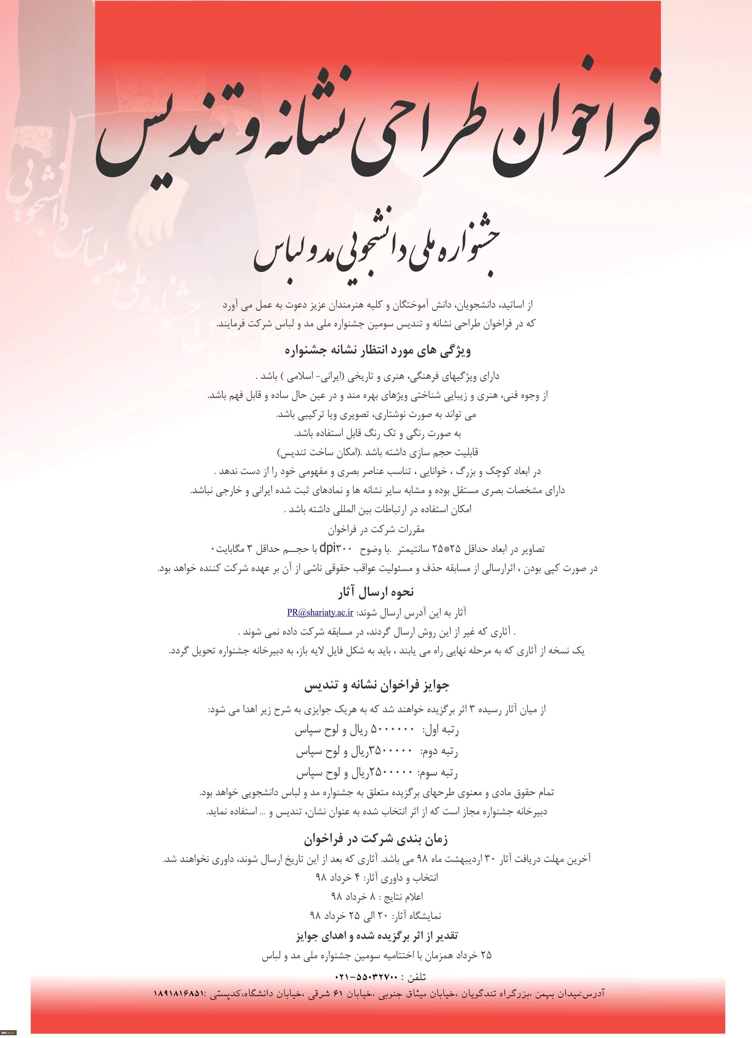 امتیاز دهید : فراخوان طراحی نشانه و تندیس جشنواره ملی دانشجویی مد و لباس دانشکده شریعتی 2 چهارشنبه 21 فروردین 1398 ساعت 11:16