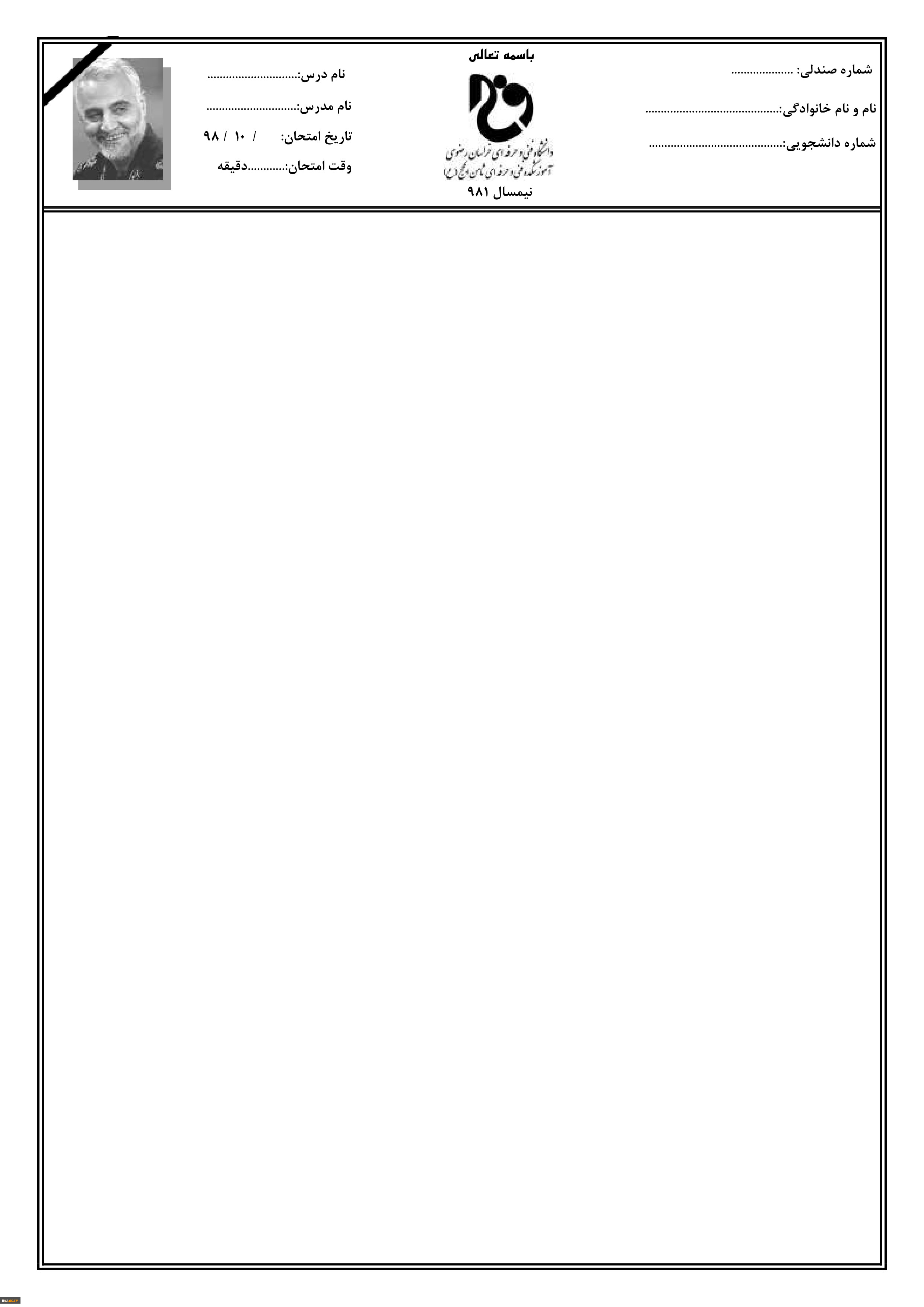امتیاز دهید : سربرگ امتحانات پایان ترم دانشکده فنی وحرفه ای ثامن الحجج (ع) با تمثال سردار سلیمانی 2 چهارشنبه 18 دی 1398 ساعت 12:18