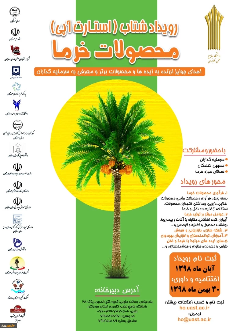 امتیاز دهید : برگزاری رویداد شتاب(استارت آپی) محصولات خرما در استان هرمزگان 2 سهشنبه 1 بهمن 1398 ساعت 10:45