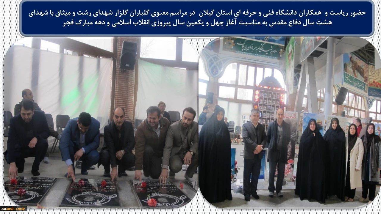 امتیاز دهید : حضور رئیس و همکاران دانشگاه فنی و حرفه ای استان گیلان در مراسم معنوی گلباران گلزار شهدای رشت و میثاق با شهدای هشت سال دفاع مقدس به مناسبت آغاز چهل و یکمین سال پیروزی انقلاب اسلامی و دهه مبارک فجر 2 یکشنبه 13 بهمن 1398 ساعت 11:16