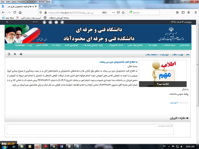 امتیاز دهید : گزارش اقدامات دانشکده فنی و حرفه ای محمودآباد در خصوص کنترل و پیشگیری از بیماری کرونا 8 چهارشنبه 14 اسفند 1398 ساعت 23:19