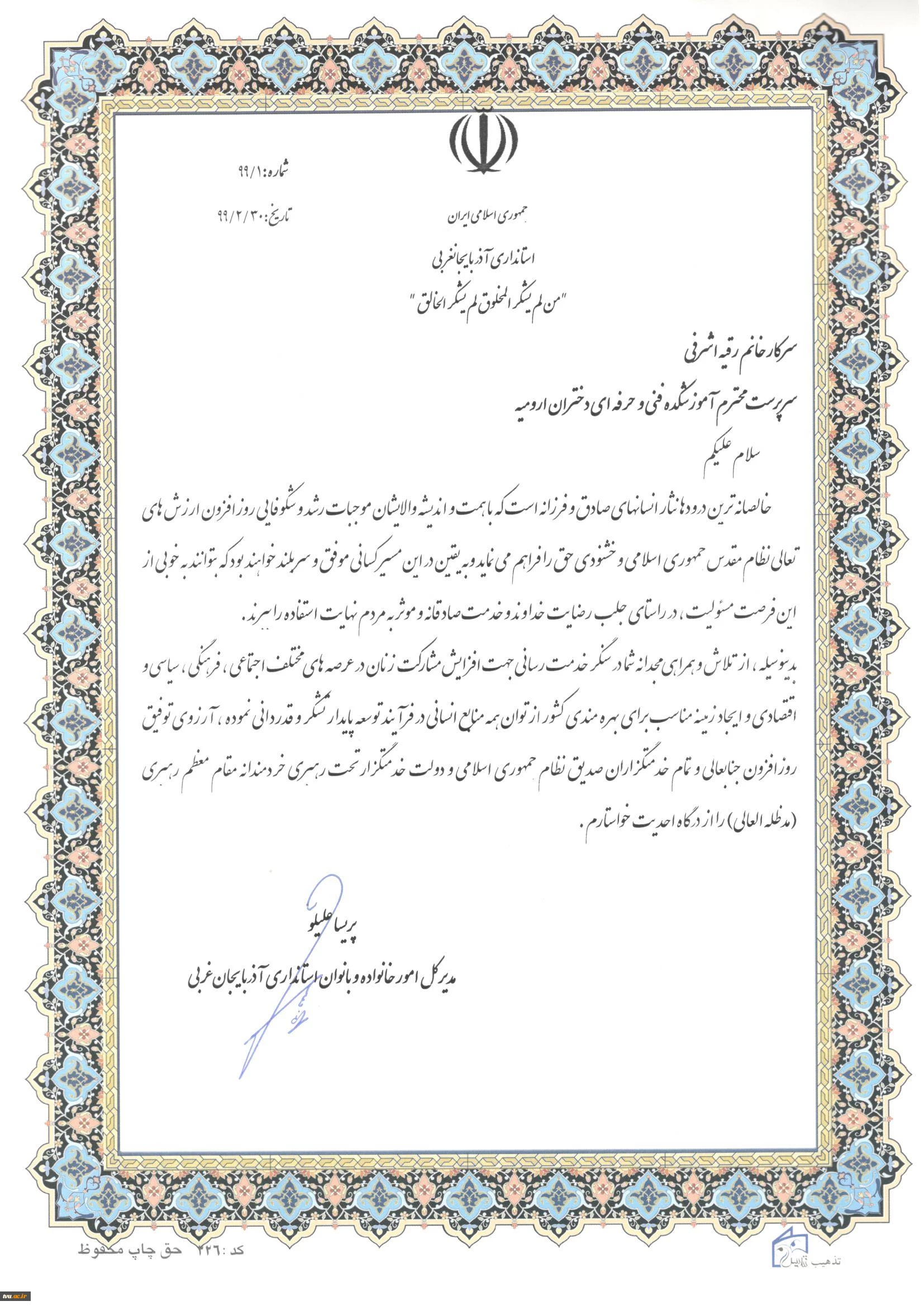 امتیاز دهید : تقدیر مدیرکل محترم امور خانواده و بانوان استانداری آذربایجان غربی از سرپرست آموزشکده دختران ارومیه 2 سهشنبه 30 اردیبهشت 1399 ساعت 12:27