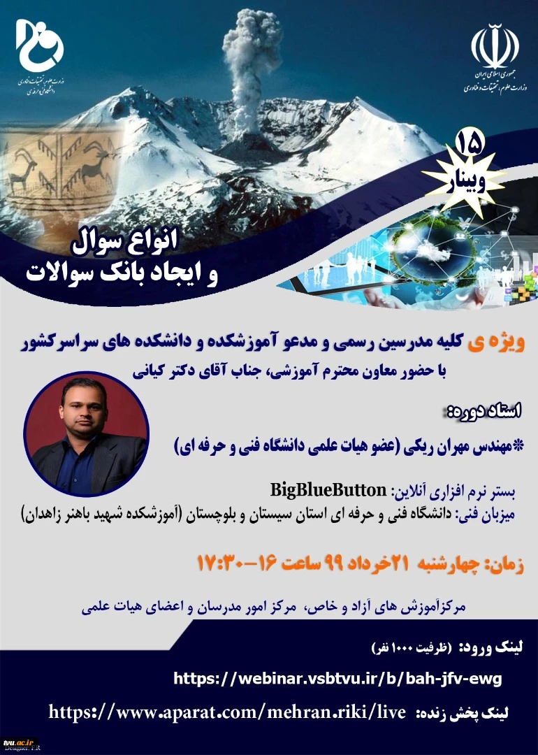 امتیاز دهید : وبینار آموزشی(( انواع سوال و ایجاد بانک سوالات بر بستر سمیاد)) 2 سهشنبه 20 خرداد 1399 ساعت 9:53