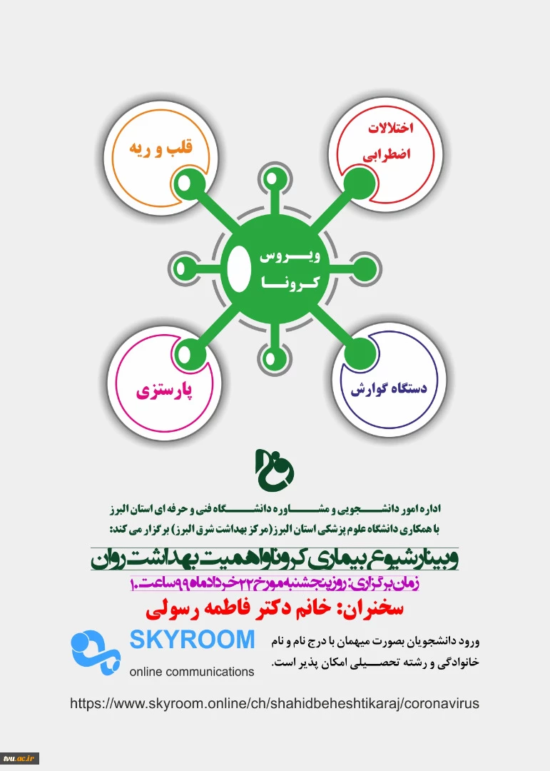 امتیاز دهید : بربرگزاری وبینار کارگاه آموزشی شیوع کرونا و اهمیت بهداشت روان در دانشگاه فنی و حرفه ای استان البرز 3 شنبه 24 خرداد 1399 ساعت 12:04