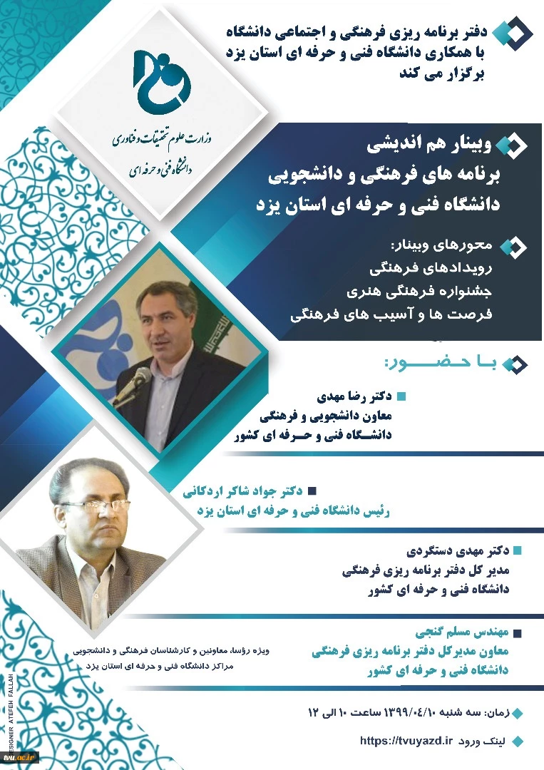 امتیاز دهید : برگزاری وبینار هم اندیشی برنامه های فرهنگی و دانشجویی به میزبانی دانشگاه فنی و حرفه ای استان یزد 2 شنبه 14 تیر 1399 ساعت 8:16
