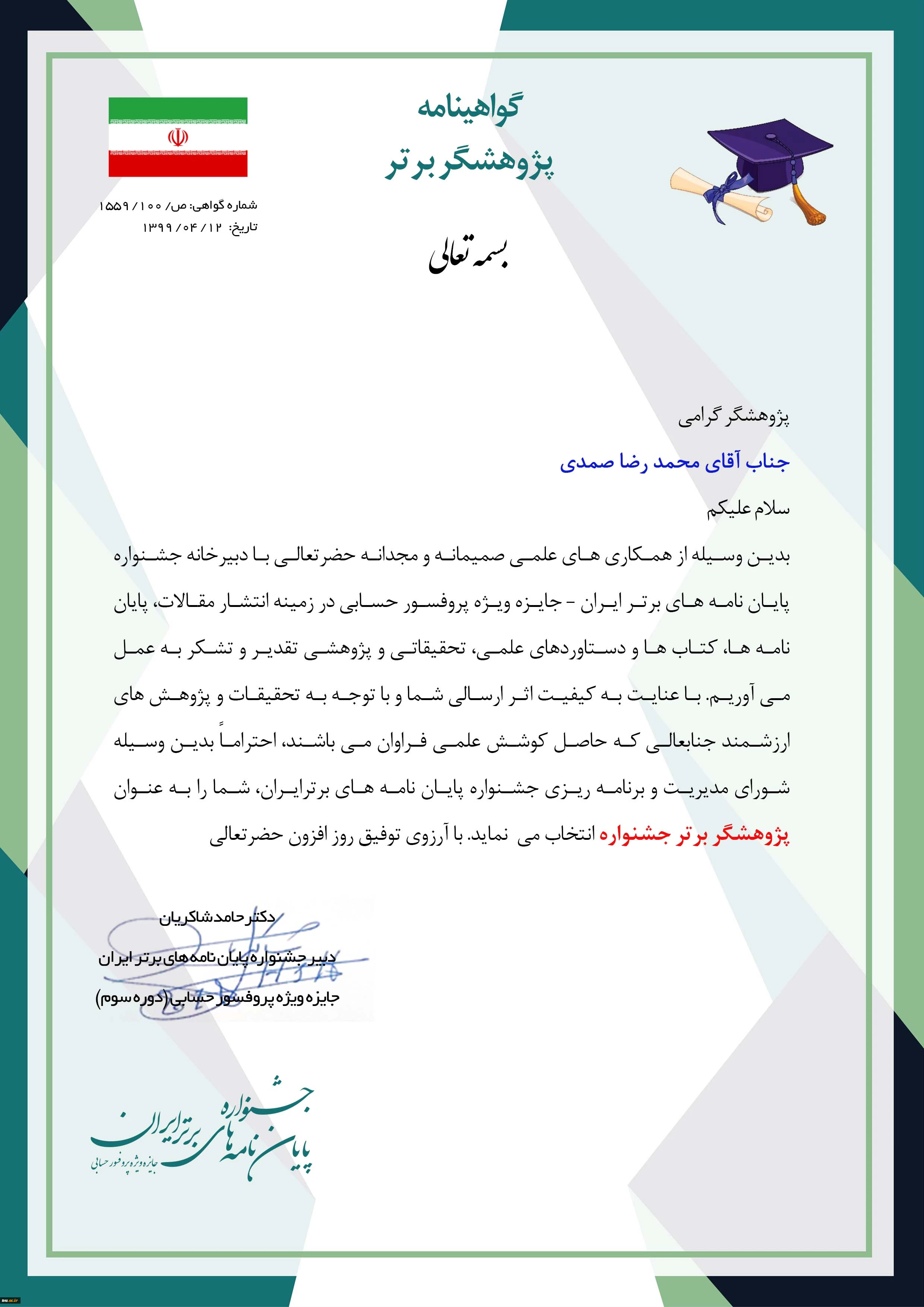 امتیاز دهید : کسب عنوان پژوهشگر برتر و نیزمقاله برتر از سومین دوره ی جشنواره پروفسور حسابی توسط آقای مهندس محمد رضا صمدی عضو هیات علمی آموزشکده فنی و حرفه ای پسران بروجرد 3 دوشنبه 16 تیر 1399 ساعت 11:54