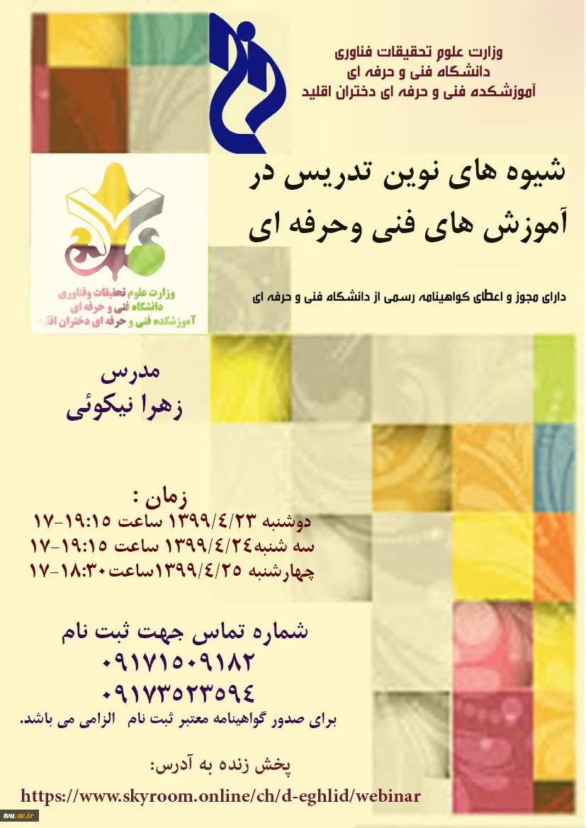 امتیاز دهید : بر گزاری دوره آموزشی شیوه های نوین تدریس در آموزشهای فنی و حرفه ای برای اساتید و کارکنان آموزشکده فنی و حرفه ای دختران اقلید 2 چهارشنبه 25 تیر 1399 ساعت 10:50