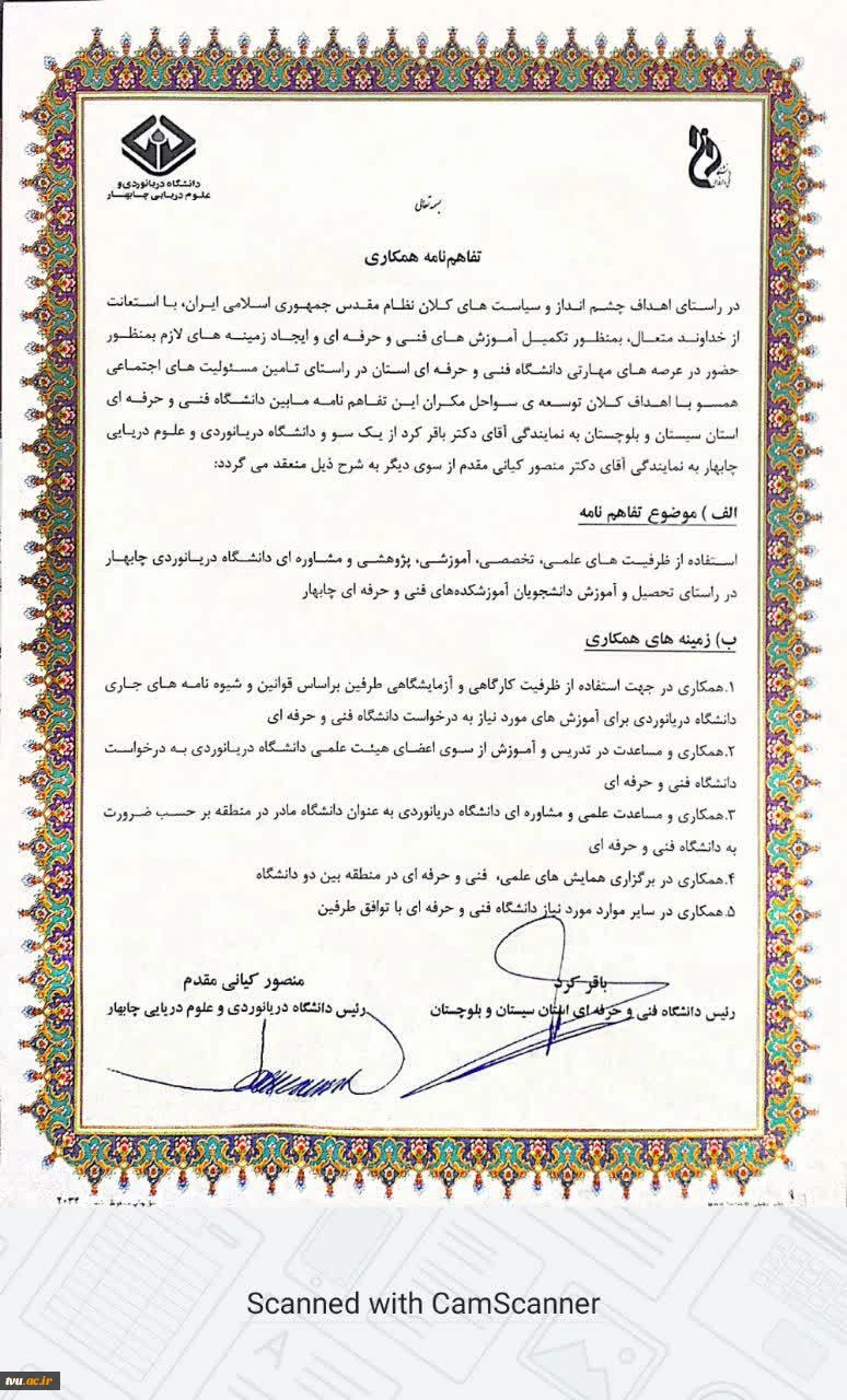امتیاز دهید : تفاهم نامه همکاری بین دانشگاه فنی و حرفه ای استان سیستان و بلوچستان ودانشگاه دریانوردی وعلوم دریایی چابهار صورت گرفت. 4 شنبه 11 مرداد 1399 ساعت 22:43