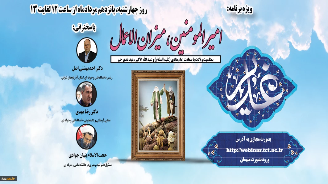 امتیاز دهید : برگزار وبینار " امیر المومنین، میزان الاعمال " بمناسبت عید غدیر خم در دانشگاه فنی و حرفه ای استان آذربایجان شرقی 2 پنجشنبه 16 مرداد 1399 ساعت 2:44