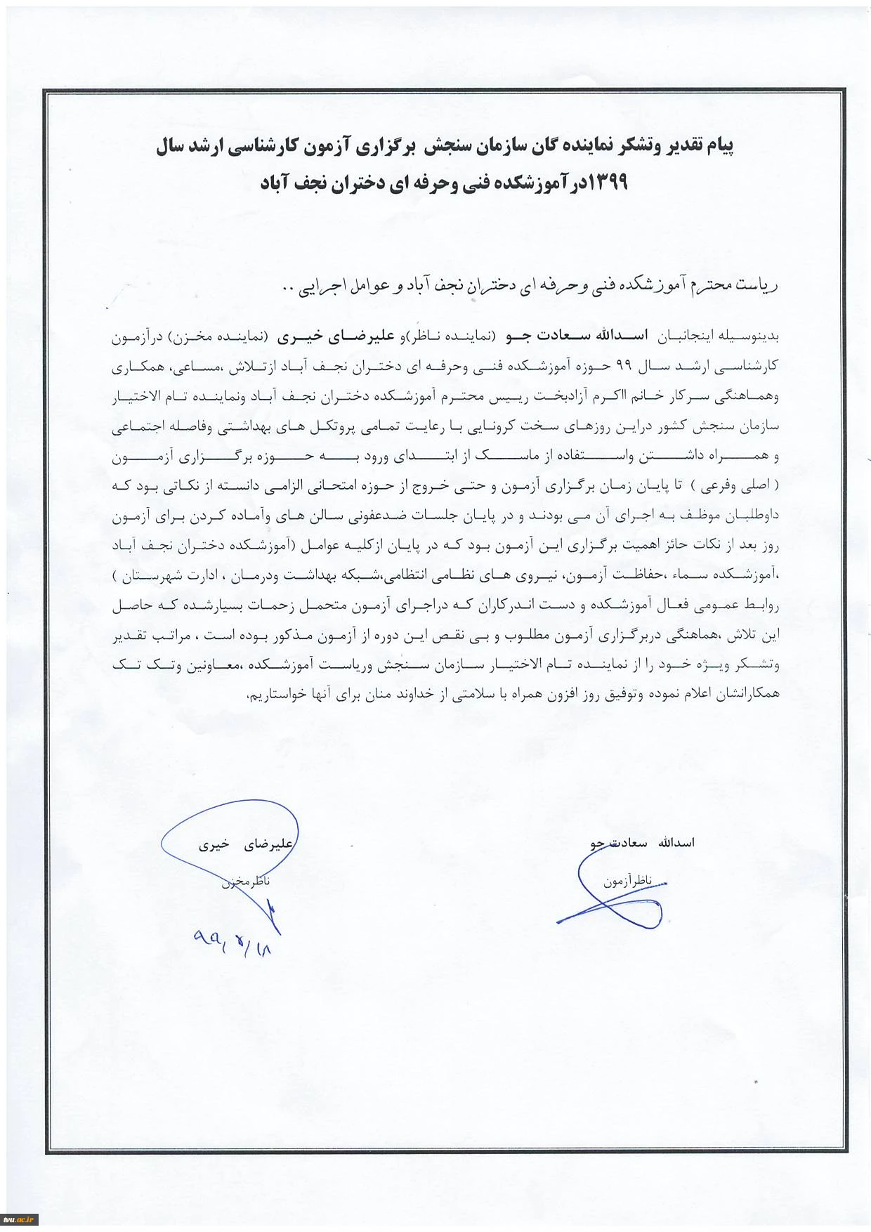 امتیاز دهید : پیام تقدیر وتشکر نماینده گان سازمان سنجش برگزاری آزمون کارشناسی ارشد سال 1399درآموزشکده فنی وحرفه ای دختران نجف آباد 2 یکشنبه 19 مرداد 1399 ساعت 9:31