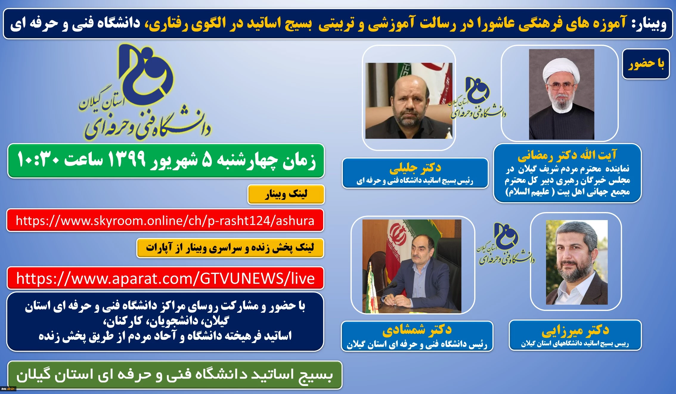 امتیاز دهید : به مناسبت دهه اول محرم و با هدف زنده نگه داشتن این ایام، وبینار آموزه های فرهنگی عاشورا در رسالت آموزشی و تربیتی بسیج اساتید در الگوی رفتاری در دانشگاه فنی و حرفه ای استان گیلان برگزار می شود. 2 سهشنبه 4 شهریور 1399 ساعت 13:34