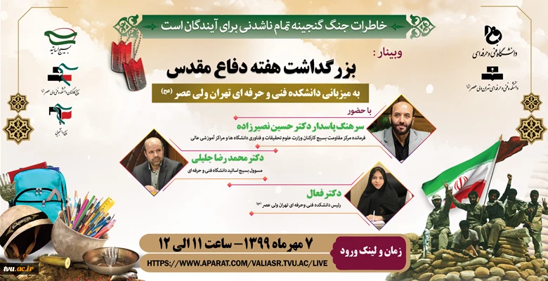 امتیاز دهید : وبینار "بزرگداشت هفته دفاع مقدس" به میزبانی دانشکده فنی تهران ولیعصر (عج) 2 یکشنبه 6 مهر 1399 ساعت 9:25