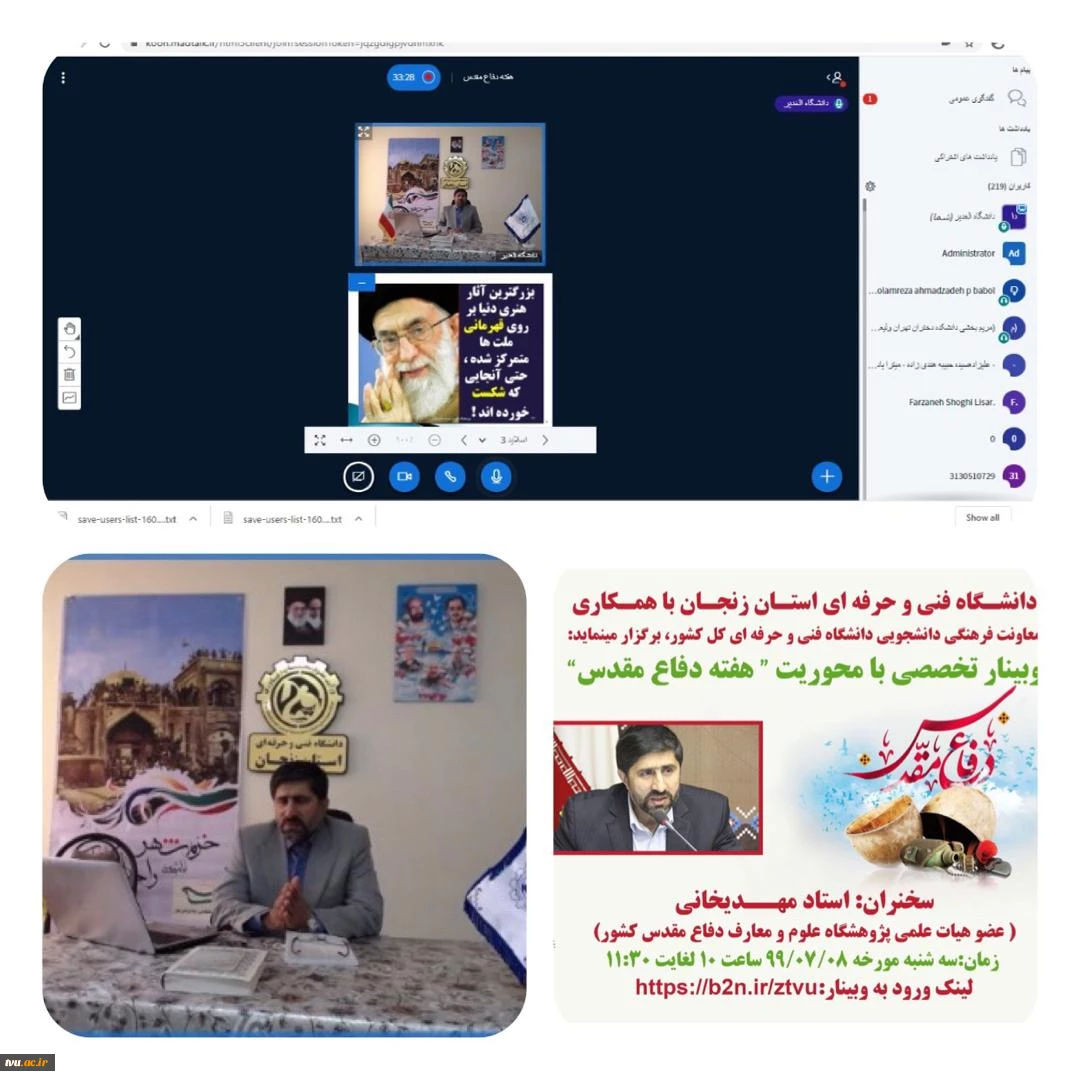 امتیاز دهید : وبینار تخصصی با محوریت " آشنایی با مبانی دفاع مقدس " با سخنرانی جناب سرهنگ علی مهدیخانی "عضو هیات علمی پژوهشگاه علوم ومعارف دفاع مقدس کشور" در دانشگاه فنی و حرفه ای استان زنجان 2 چهارشنبه 9 مهر 1399 ساعت 11:46