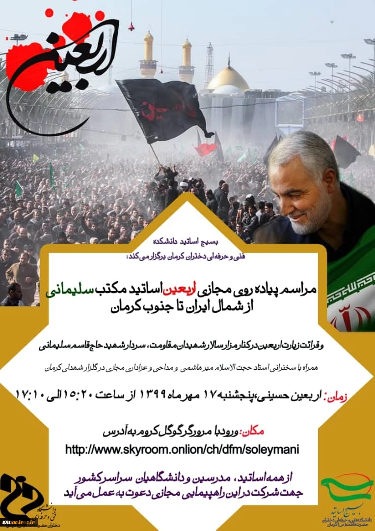 امتیاز دهید : برگزاری مراسم پیاده روی اربعین از شمال تا جنوب بصورت مجازی با همکاری دانشکده فنی و حرفه ای محمودآباد و دانشگاه فنی و حرفه ای دختران کرمان 2 شنبه 19 مهر 1399 ساعت 7:54