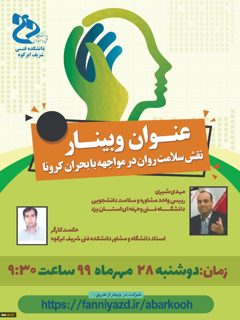 امتیاز دهید : برگزاری وبینار سلامت روان در مواجهه با ویروس کرونا در دانشکده فنی و حرفه ای شریف ابرکوه 2 پنجشنبه 1 آبان 1399 ساعت 9:34