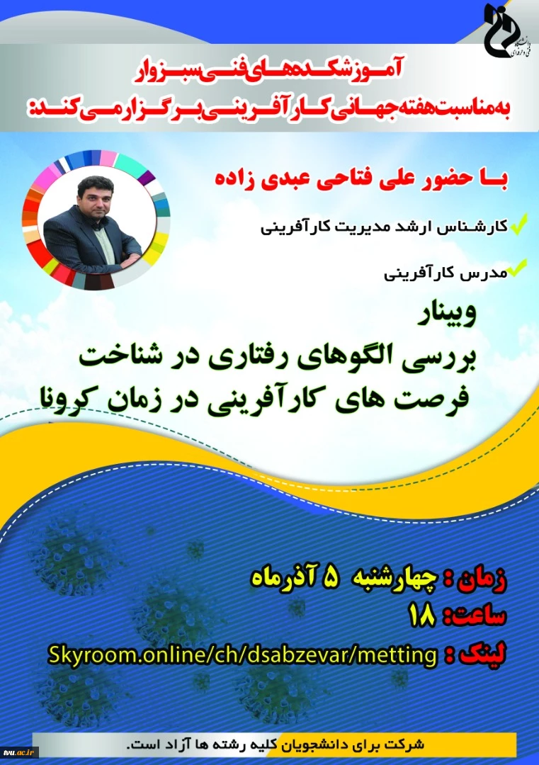 امتیاز دهید : برگزاری وبینار بررسی الگوهای رفتاری در شناخت فرصت های کارآفرینی در زمان کرونا 2 سهشنبه 4 آذر 1399 ساعت 13:20