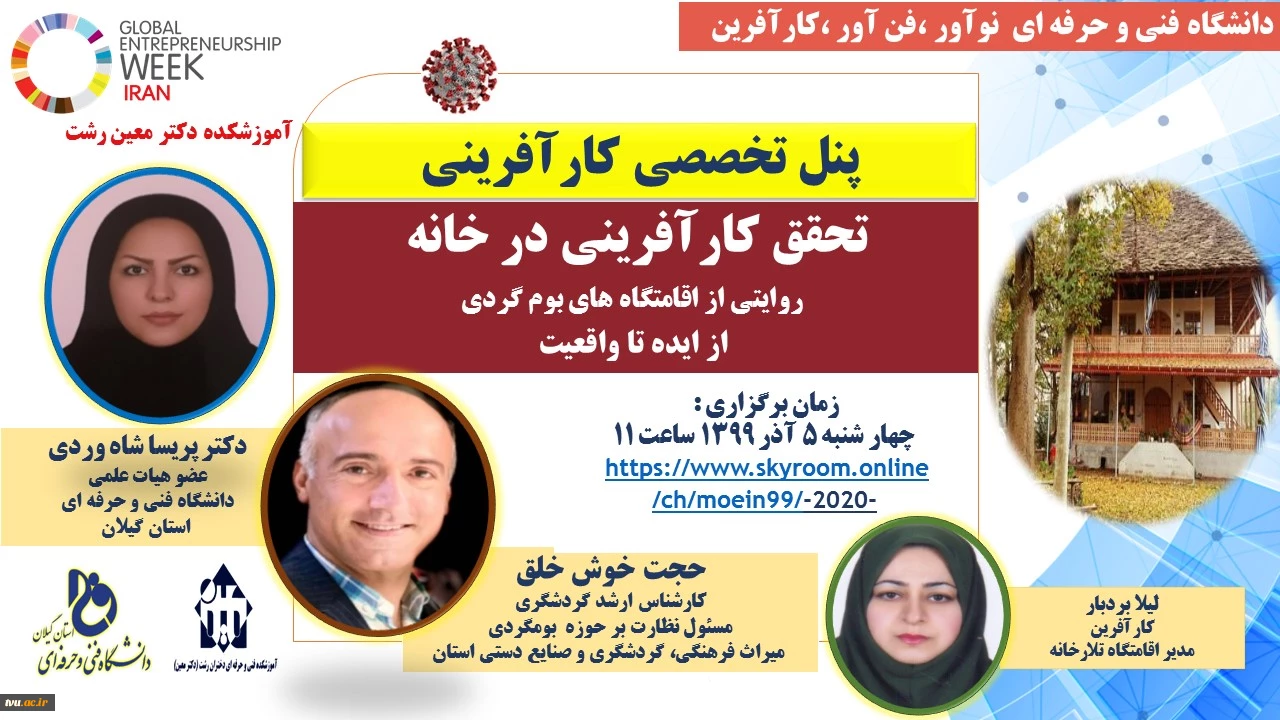امتیاز دهید : اولین پنل تخصصی کارآفرینی " تحقق کارآفرینی در خانه روایتی از اقامتگاه های بوم گردی از ایده تا واقعیت ،- آموزشکده دکتر معین رشت 2 چهارشنبه 5 آذر 1399 ساعت 13:45