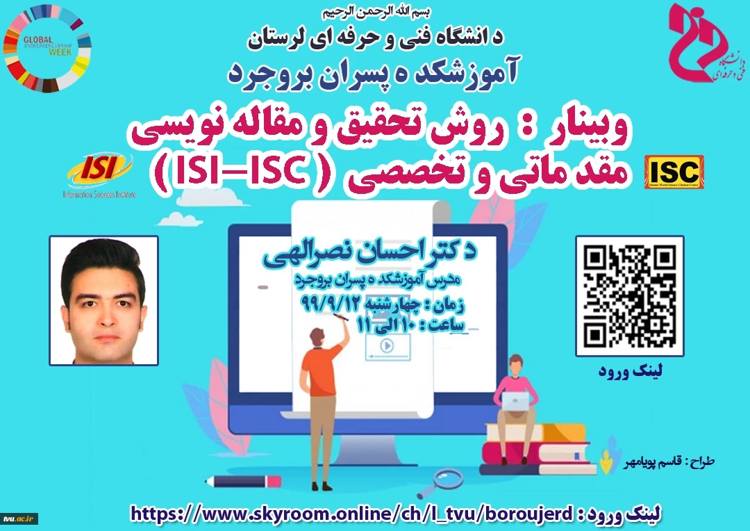امتیاز دهید : برگزاری وبینار کشوری به مناسبت فرارسیدن هفته پژوهش با موضوع "روش تحقیق و مقاله نویسی مقدماتی و تخصصی " به میزبانی آموزشکده فنی پسران بروجرد 2 سهشنبه 11 آذر 1399 ساعت 9:41
