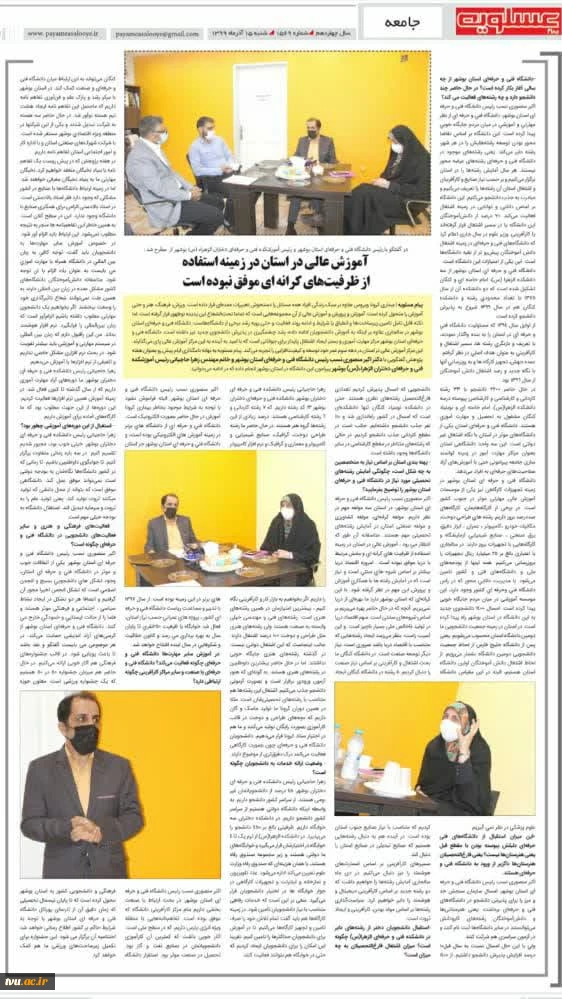 امتیاز دهید : گفتگو با رئیس دانشگاه فنی و حرفهای استان بوشهر و رئیس دانشکده فنی و حرفه ای دختران الزهرا(س)بوشهر 3 شنبه 15 آذر 1399 ساعت 13:01
