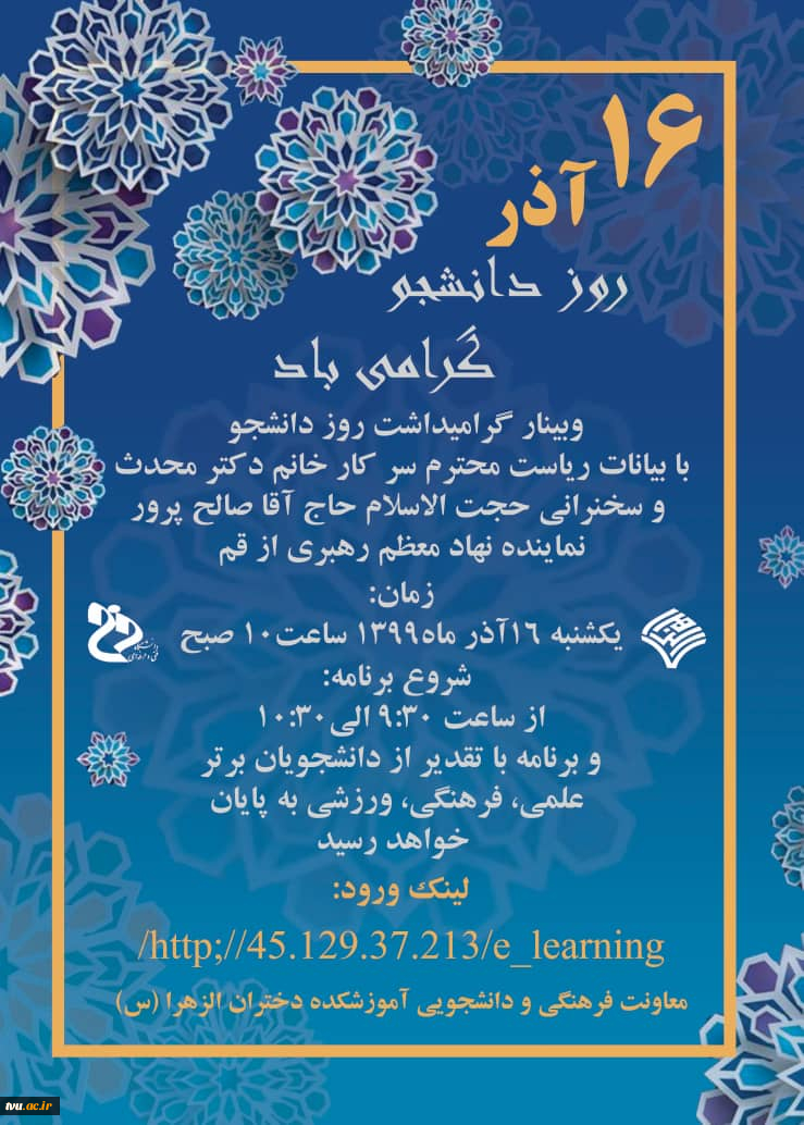 امتیاز دهید : برگزاری وبینار گرامیداشت روز دانشجو آموزشکده فنی و حرفه ای دختران مشهد 2 یکشنبه 16 آذر 1399 ساعت 13:34