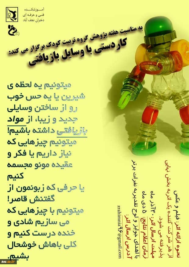 امتیاز دهید : بمناسبت هفته پژوهش وبینارهایی در آموزشکده فنی وحرفه ای دختران نجف اباد برگزار می گردد 8 سهشنبه 18 آذر 1399 ساعت 11:20