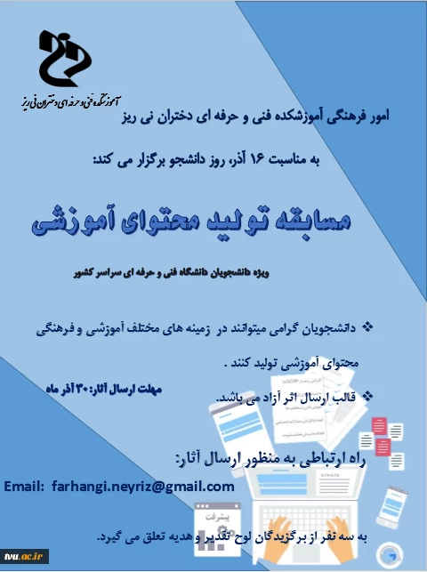 امتیاز دهید : برگزاری مسابقه تولید محتوای آموزشی ویژه دانشجویان دانشگاه فنی و حرفه ای سراسر کشور به مناسبت 16 آذر روز دانشجو 2 شنبه 22 آذر 1399 ساعت 8:46