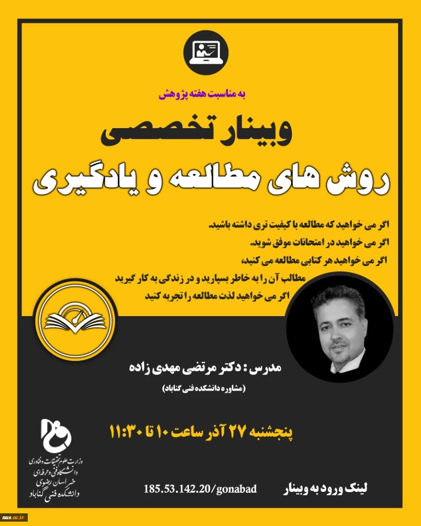 امتیاز دهید : آموزشکده فنی و حرفه ای گناباد به مناسبت هفته پژوهش برگزار می کند: 2 دوشنبه 24 آذر 1399 ساعت 9:05