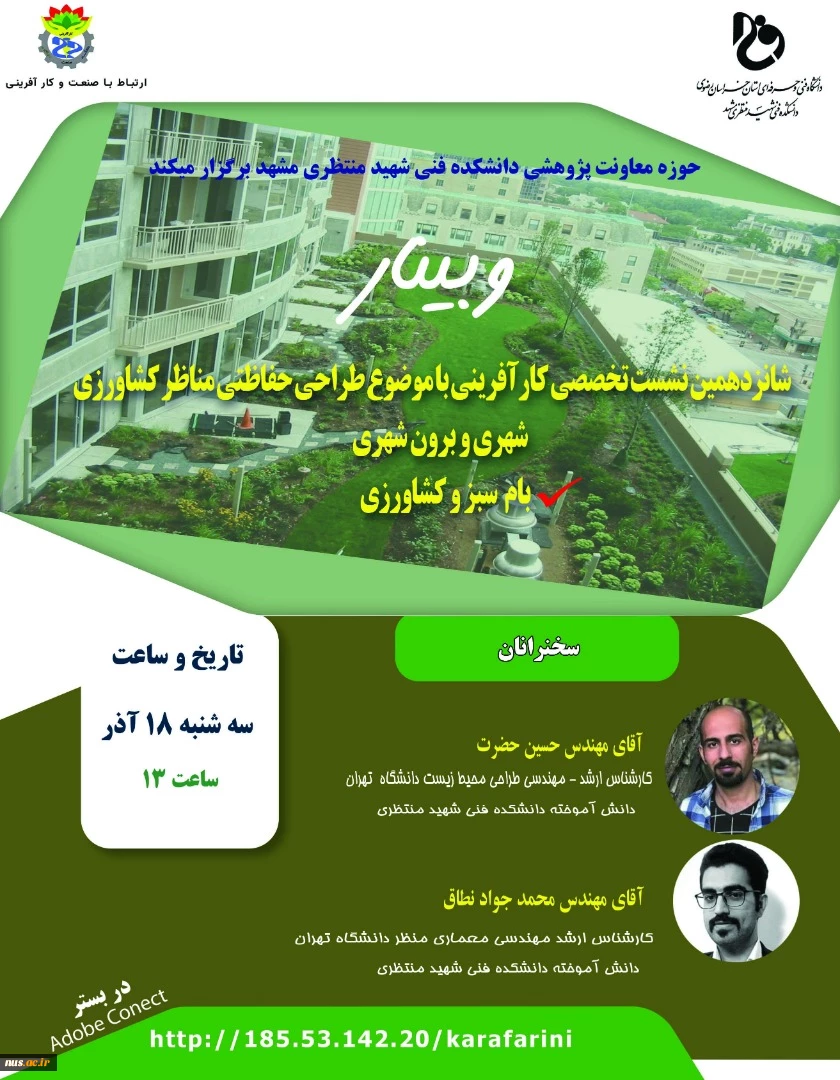 امتیاز دهید : حوزه معاونت پژوهشی دانشکده فنی شهید منتظری مشهد(دفتر ارتباط با صنعت) برگزار کرد شانزدهمین نشست تخصصی کار آفرینی باموضوع:وبینارطراحی حفاظتی مناظر کشاورزی شهری و برون شهری (بام سبز) 2 سهشنبه 25 آذر 1399 ساعت 8:18