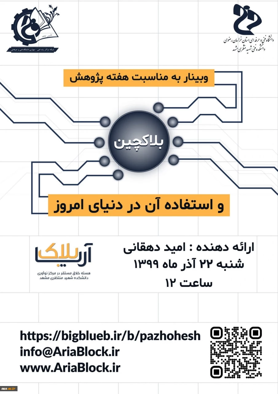 امتیاز دهید : اولین وبینار تخصصی در خصوص آشنایی با کاربردهای مختلف حوزه زنجیره ی بلوکها در دانشکده فنی شهید منتظری 2 سهشنبه 25 آذر 1399 ساعت 9:15