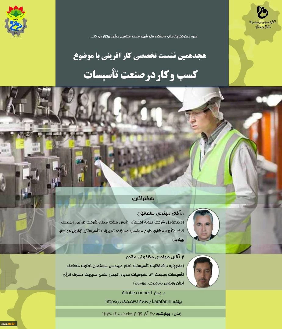 دانشکده فنی شهید منتظری مشهد هجدهمین نشست تخصصی کارآفرینی با موضوع کسب و کار در صنعت تاسیسات برگزارنمود مهندس سلطانیان رئیس محترم هیات مدیره شرکت کنگ دژ آریا و عضو سازمان نظام مهندسی :رمز موفقیت دانشجویان در بازار کسب و کار ، عجین شدن آنها با کار دانست 2