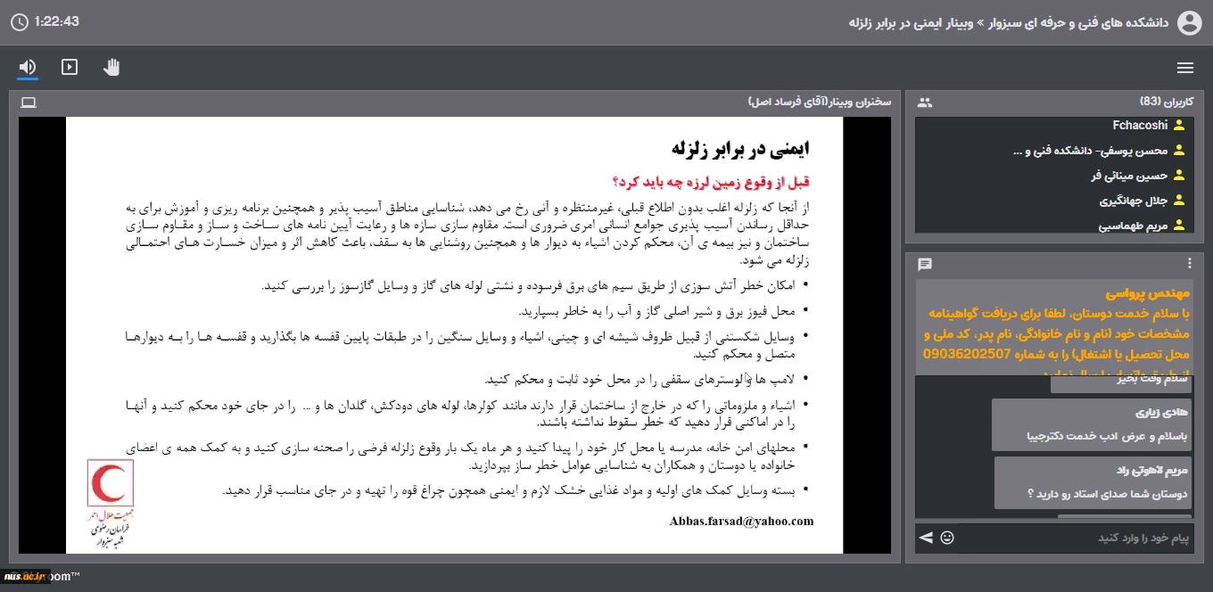 امتیاز دهید : برگزاری وبینار ایمنی در برابر زلزله در دانشکده های فنی و حرفه ای سبزوار 3 شنبه 6 دی 1399 ساعت 18:13