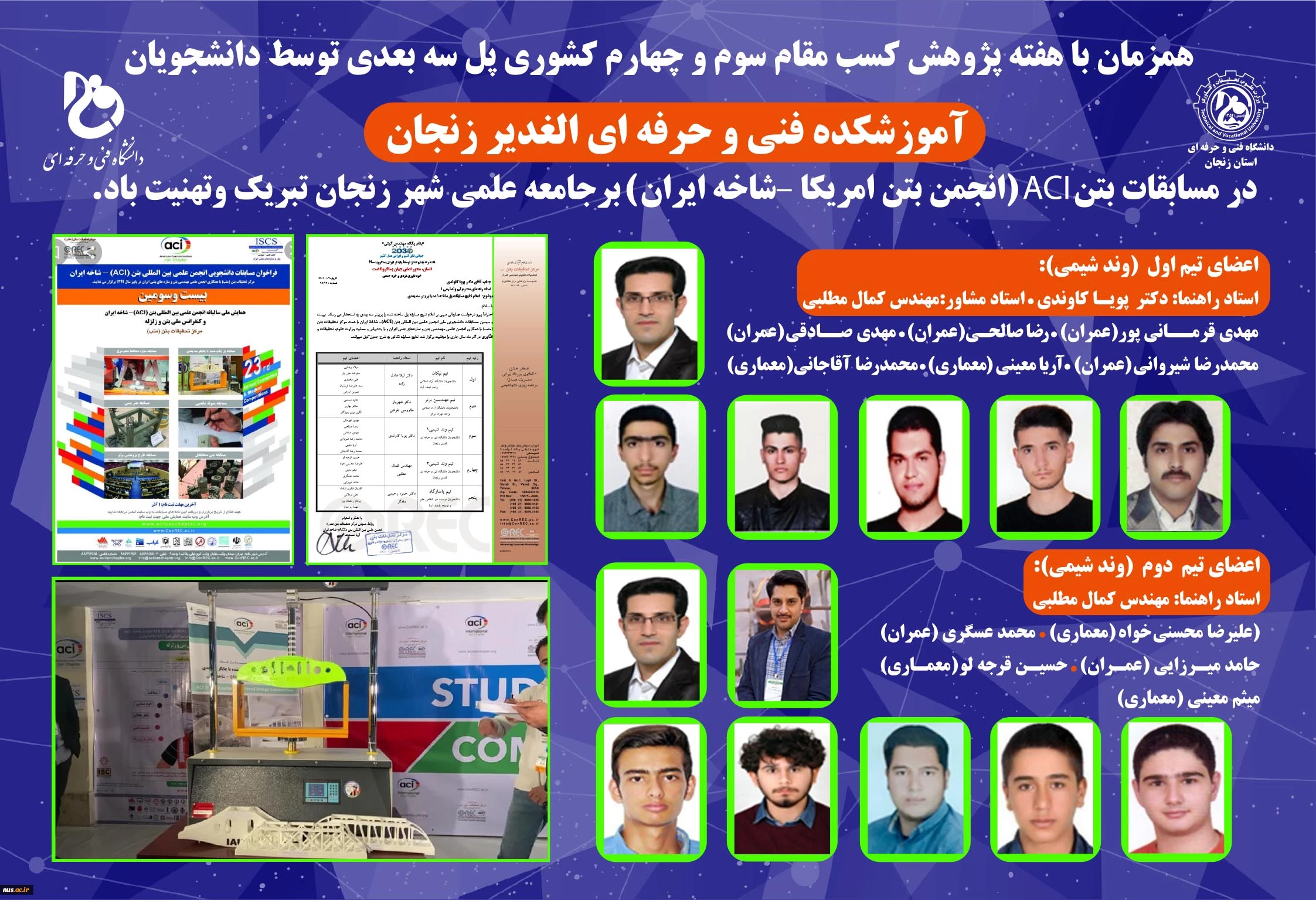 همزمان با هفته پژوهش1399 کسب مقام سوم کشوری پل سه بعدی در مسابقات بتن ACI(انجمن بتن امریکا –شاخه ایران ) توسط دانشجویان دانشکده فنی وحرفه ای الغدیر زنجان 2