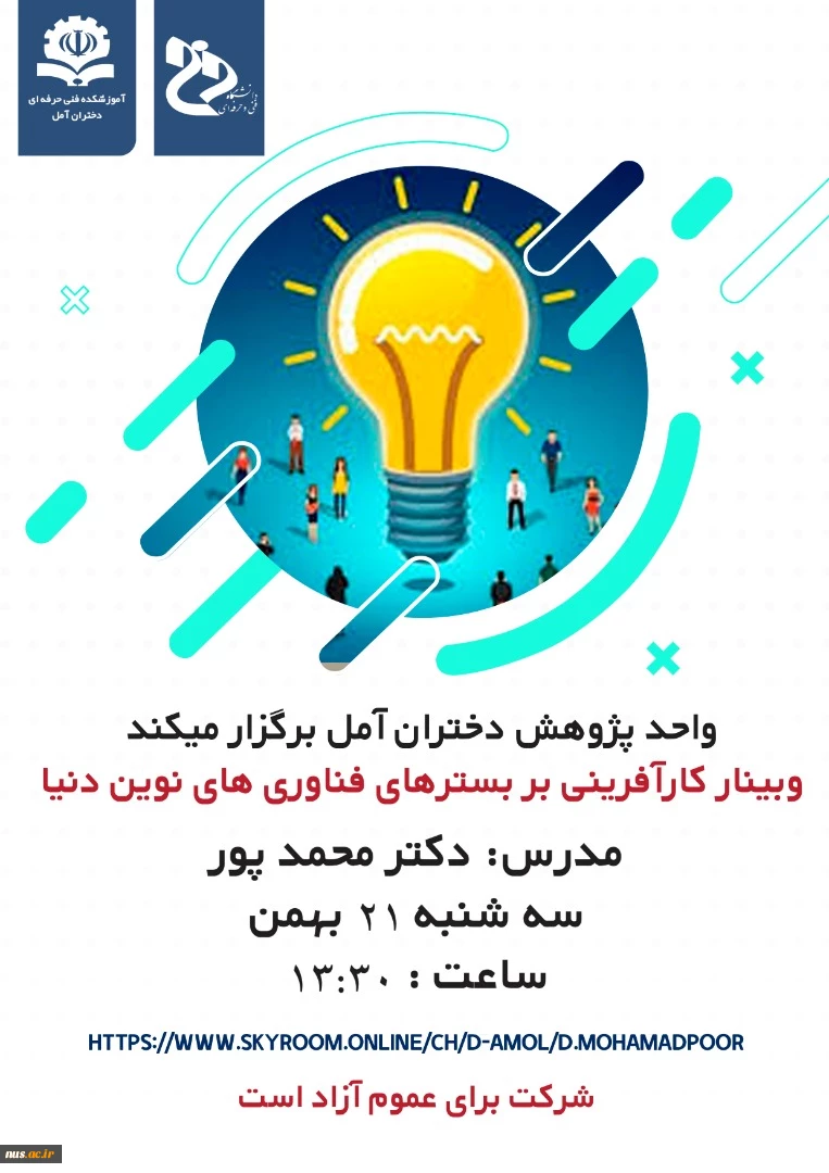 امتیاز دهید : برگزاری وبینار کارآفرینی بر بستر فناوری نوین دنیا در آموزشکده فنی دختران آمل 2 دوشنبه 27 بهمن 1399 ساعت 20:51