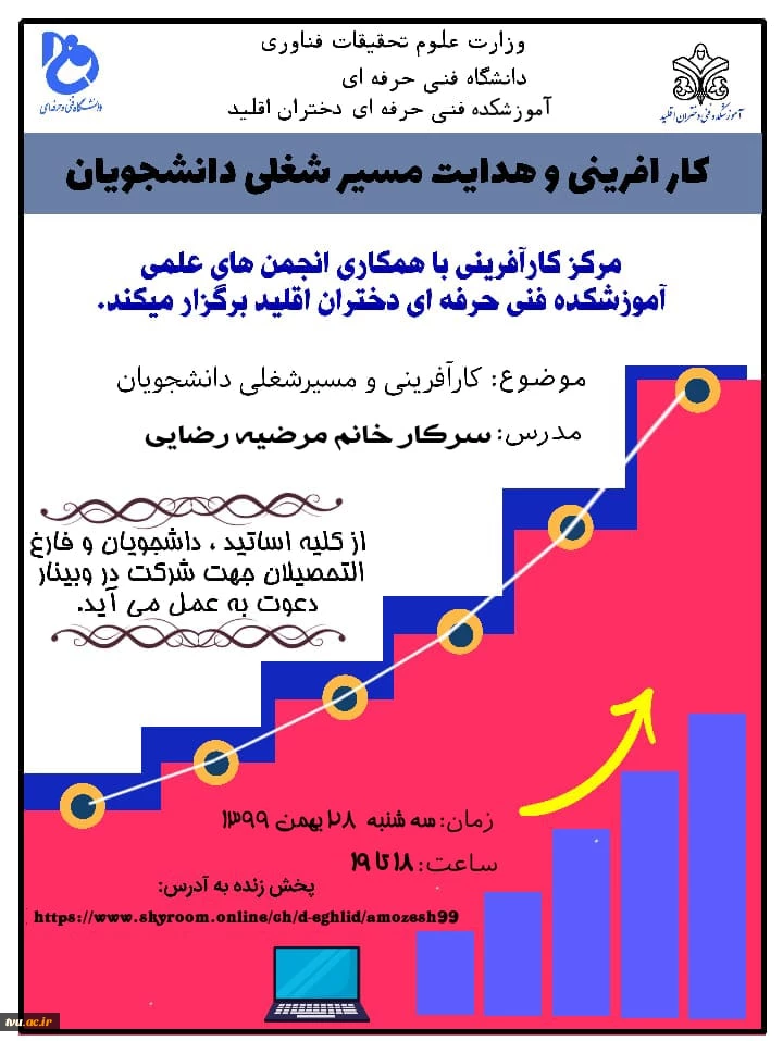 امتیاز دهید : برگزاری وبینار کارآفرینی و هدایت مسیر شغلی دانشجویان در آموزشکده فنی و حرفه ای اقلید 2 چهارشنبه 29 بهمن 1399 ساعت 9:22