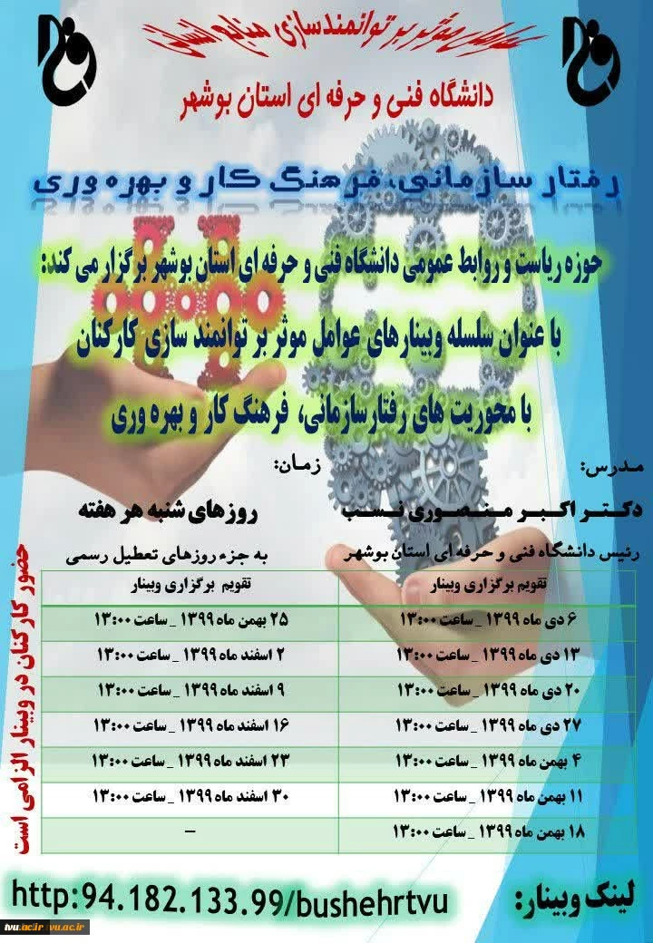 امتیاز دهید : برگزاری سلسله وبینارهای عوامل موثر بر توانمندسازی کارکنان 2 جمعه 15 اسفند 1399 ساعت 10:19