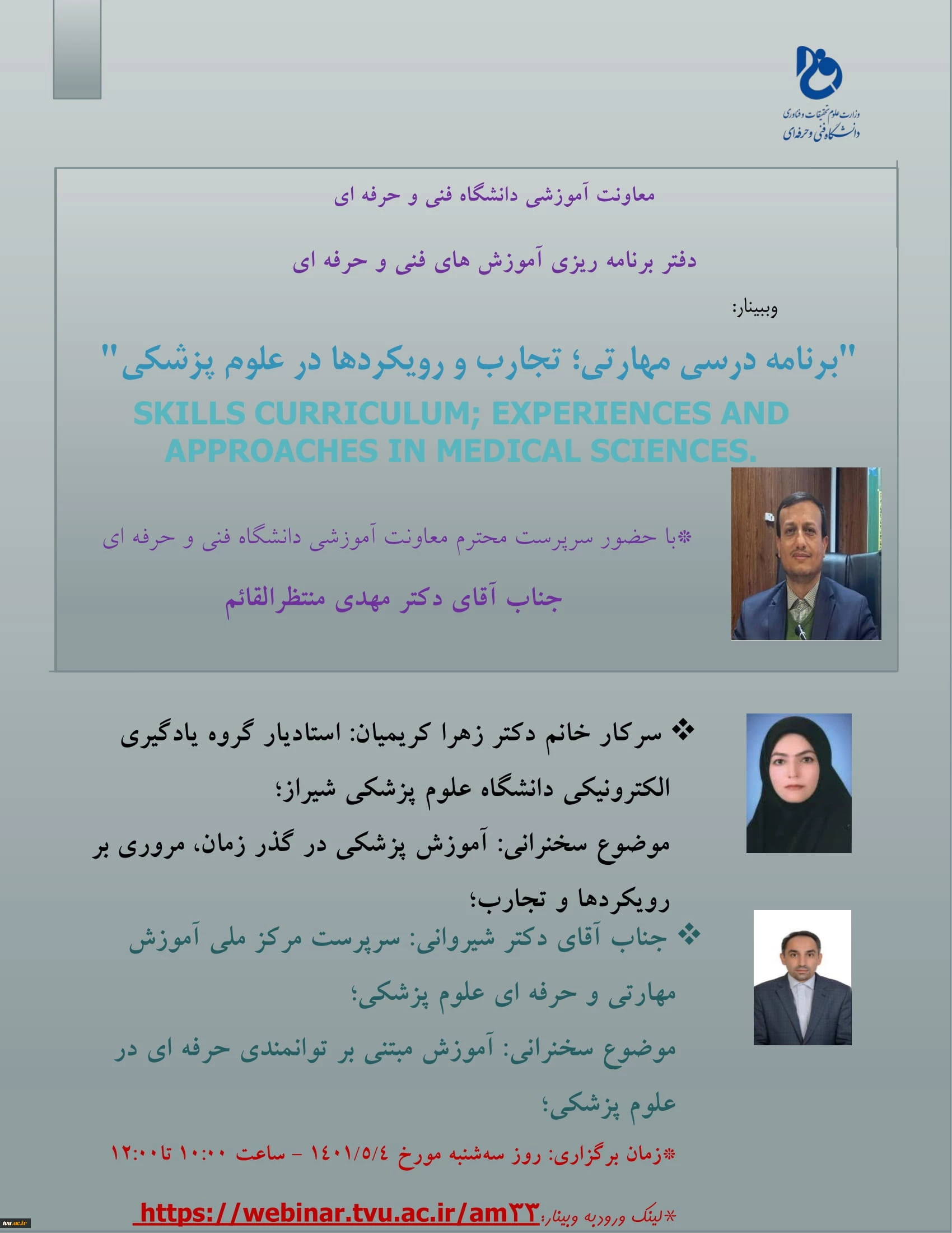 امتیاز دهید : وبینار برنامه درسی مهارتی؛ تجارب و رویکردها در علوم پزشکی 3 یکشنبه 2 مرداد 1401 ساعت 14:43