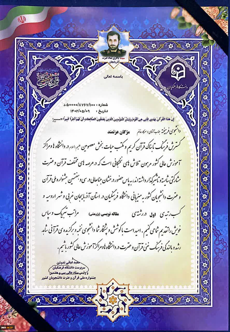 امتیاز دهید : دانشجوی آموزشکده فنی و حرفهای الزهرا «س» تبریز مقام اول مقالهنویسی در جشنواره ملی قرآن و عترت را کسب کرد 2 چهارشنبه 18 مرداد 1402 ساعت 10:18