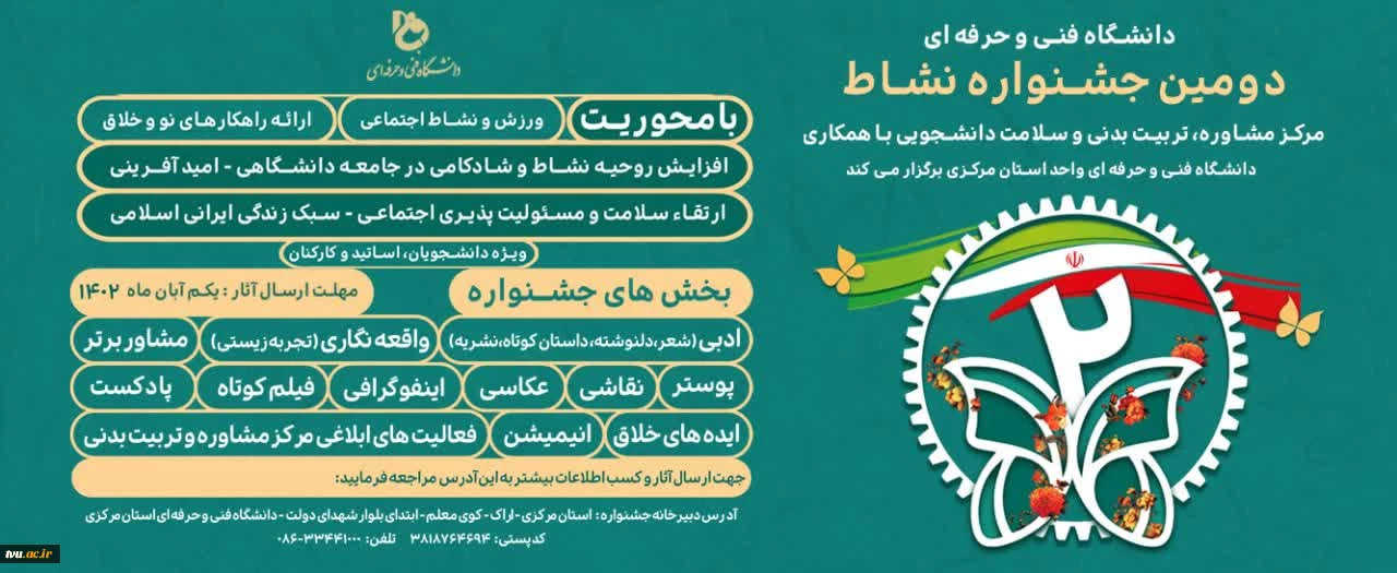 امتیاز دهید : مرکز مشاوره، تربیت بدنی و سلامت دانشجویی با همکاری دانشگاه فنی و حرفهای استان مرکزی برگزار میکند: دومین جشنواره نشاط 2 دوشنبه 20 شهریور 1402 ساعت 10:47
