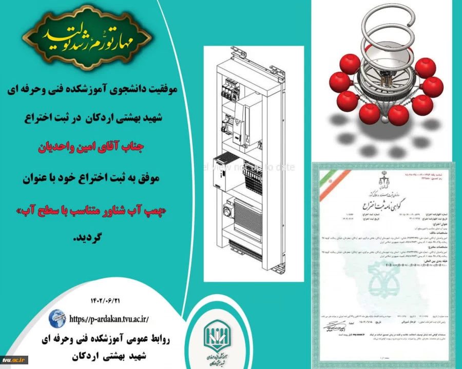 امتیاز دهید : ثبت اختراع توسط آقای امین واحدیان، دانشجوی رشته برق آموزشکده فنی و حرفه ای شهید بهشتی اردکان با عنوان : «پمپ آب شناور متناسب با سطح آب» در شهریورماه 1402 2 پنجشنبه 23 شهریور 1402 ساعت 7:27