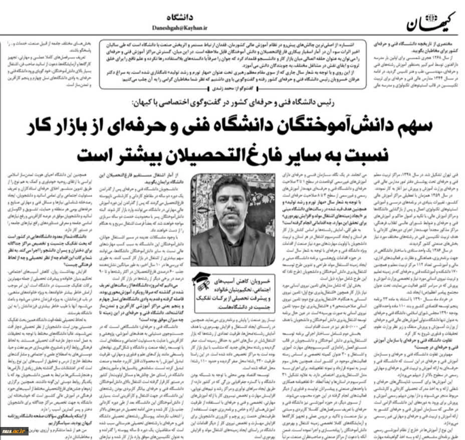امتیاز دهید : رئیس دانشگاه فنی و حرفهای کشور در گفتوگوی اختصاصی با کیهان: سهم دانشآموختگان دانشگاه فنی و حرفهای از بازار کار نسبت به سایر فارغالتحصیلان بیشتر است 2 پنجشنبه 30 شهریور 1402 ساعت 13:23
