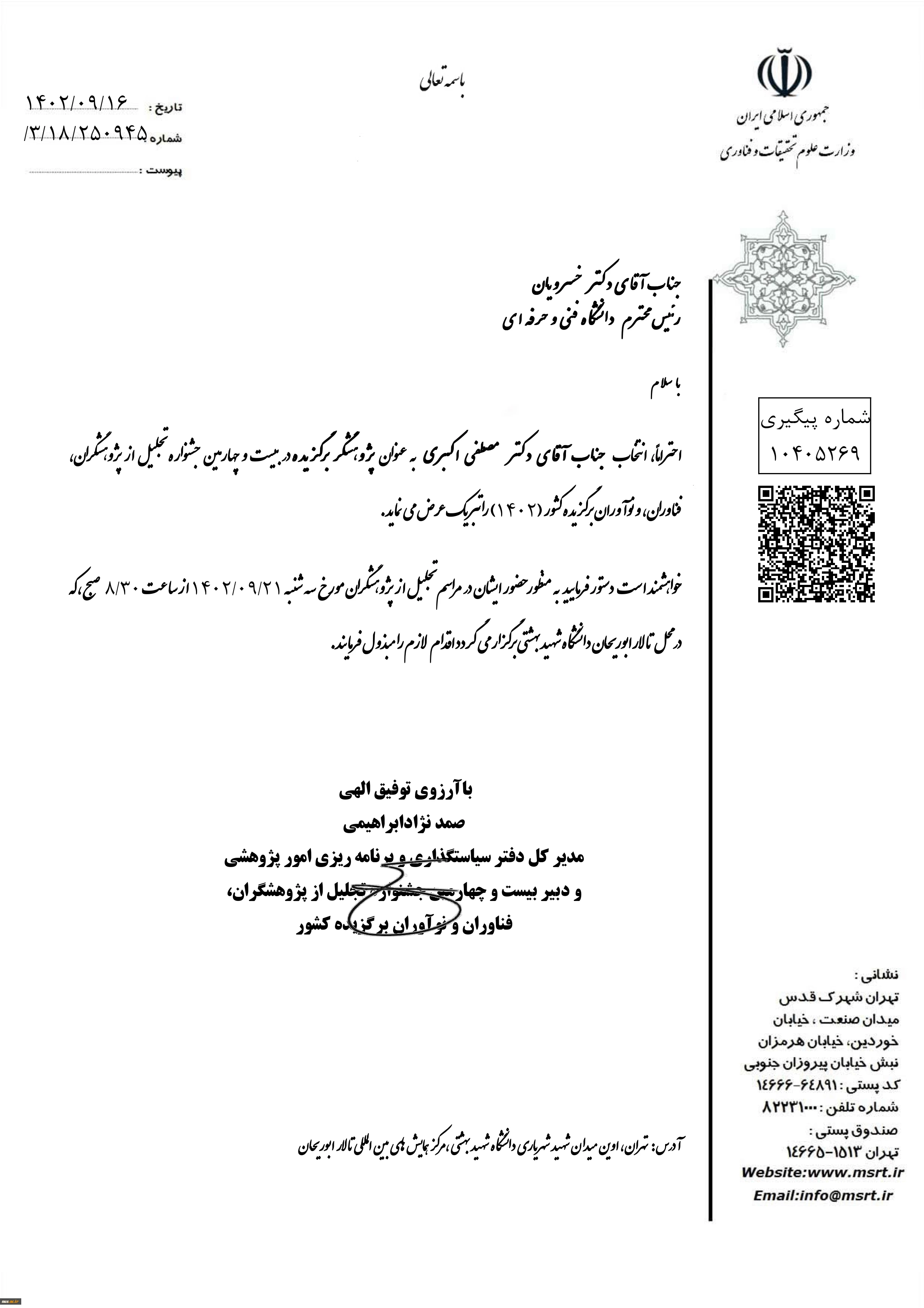 بیست و چهارمین جشنواره تجلیل از پژوهشگران، فناوران و نوآوران برگزیده کشور (1402) 2