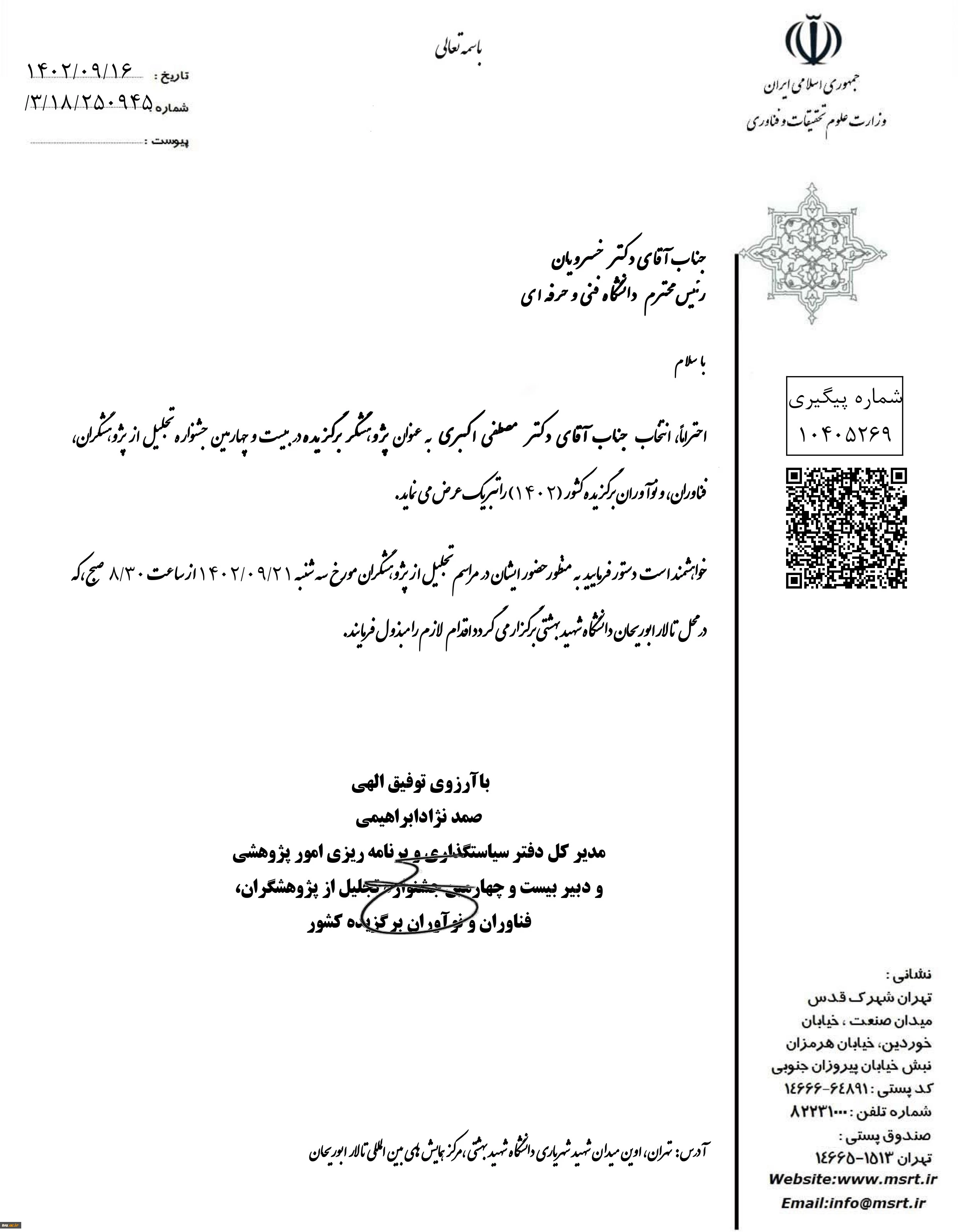 انتخاب پژوهشگر دانشگاه فنی و حرفه‌ای به عنوان پژوهشگر برتر کشوری؛ بیست و چهارمین جشنواره تجلیل از پژوهشگران، فناوران و نوآوران برگزیده کشور (1402) 2