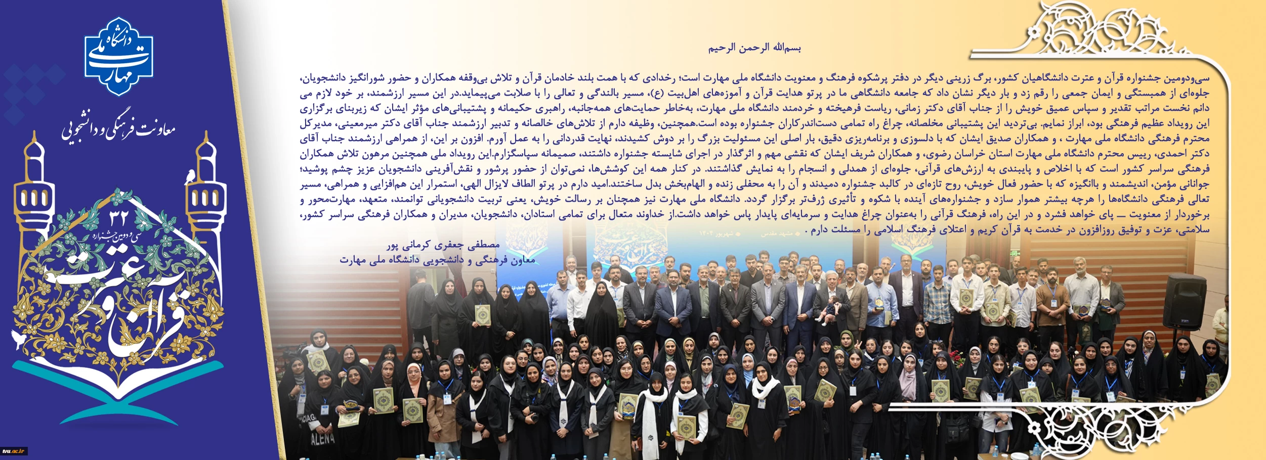 پیام معاون فرهنگی و دانشجویی دانشگاه ملی مهارت به مناسبت برگزاری شکوهمند سی‌ودومین جشنواره قرآن و عترت 2