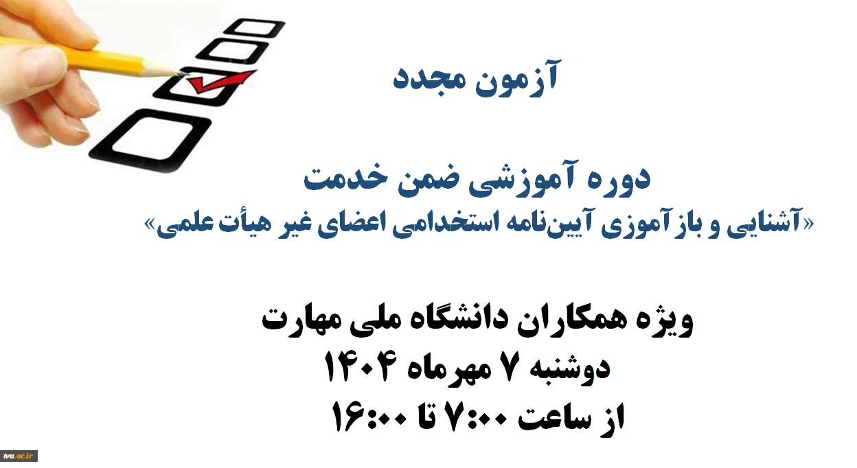 امتیاز دهید : آزمون مجدد دوره آموزشی ضمن خدمت با عنوان «آشنایی و بازآموزی آییننامه استخدامی اعضای غیر هیأت علمی» 2 یکشنبه 6 مهر 1404 ساعت 9:41