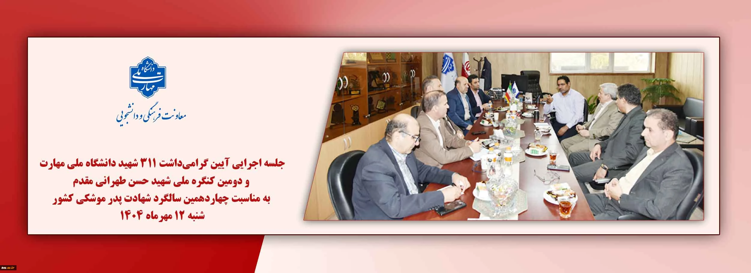 امتیاز دهید : جلسه اجرایی آیین گرامیداشت ۳۱۱ شهید دانشگاه ملی مهارت و دومین کنگره ملی شهید حسن طهرانی مقدم به مناسبت چهاردهمین سالگرد شهادت پدر موشکی کشور 2 یکشنبه 13 مهر 1404 ساعت 10:01