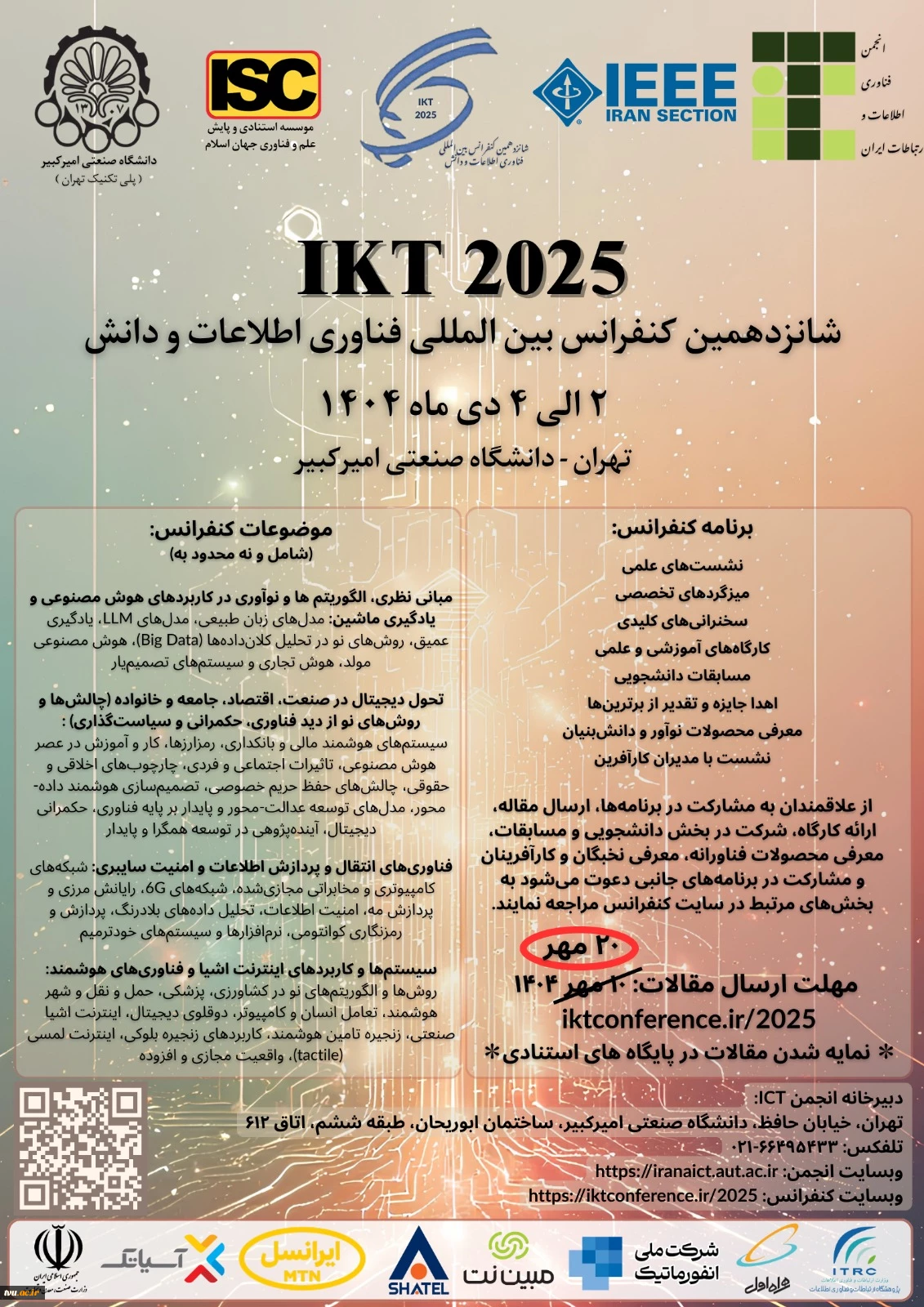 امتیاز دهید : IKT 2025 شانزدهمین کنفراس بین المللی فناوری اطلاعات و دانش 2 سهشنبه 15 مهر 1404 ساعت 8:57