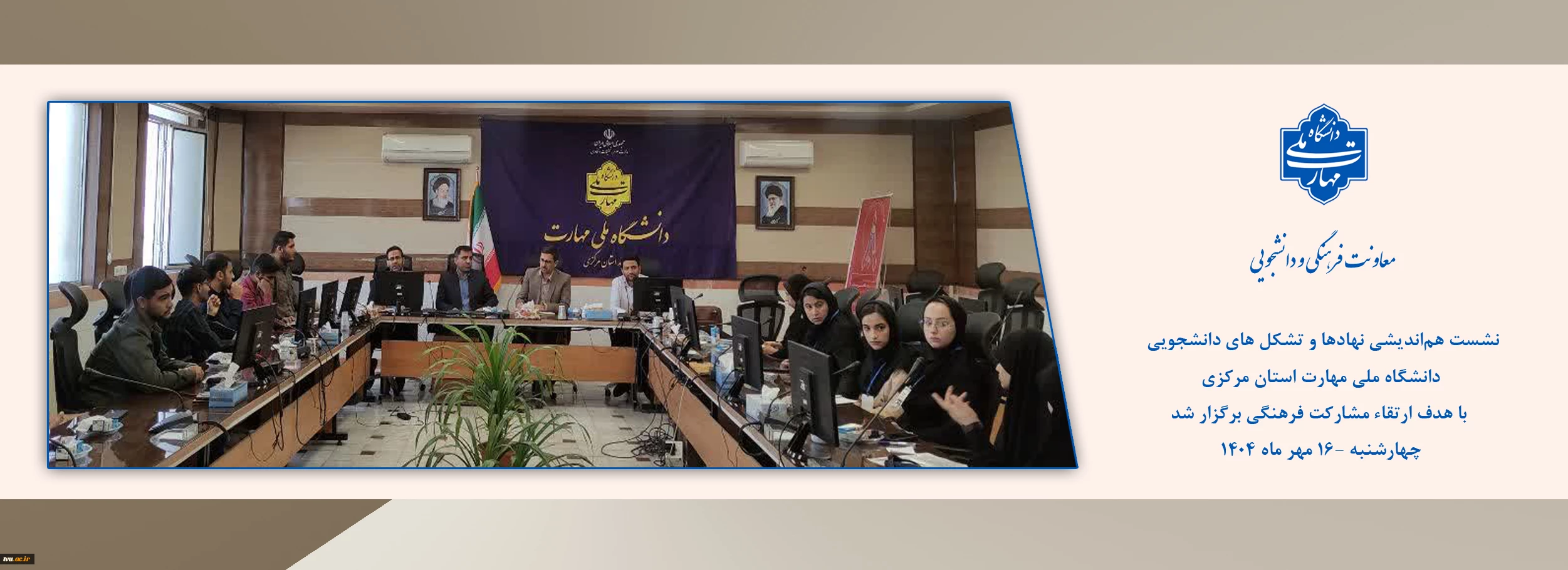 امتیاز دهید : نشست هماندیشی نهادها و تشکل های دانشجویی دانشگاه ملی مهارت استان مرکزی با هدف ارتقاء مشارکت فرهنگی برگزار شد. 2 چهارشنبه 16 مهر 1404 ساعت 13:06