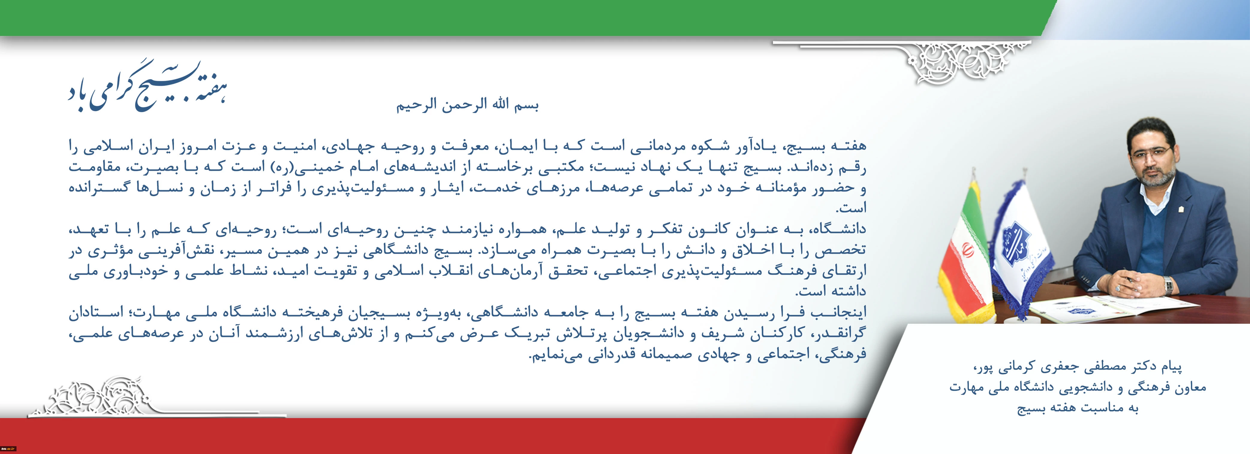 امتیاز دهید : پیام تبریک دکترمصطفی جعفری کرمانی پور به مناسبت هفته بسیج 2 یکشنبه 2 آذر 1404 ساعت 16:48